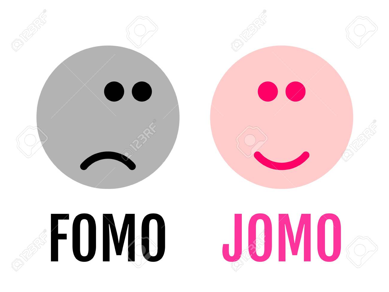 Two Funny Emojis Showing The Difference Between Fomo And Jomo Jomo Means Joy Of Missing Out Fomo Means Fear Of Missing Out Stock Illustration Illustration Of Media Design 180226102